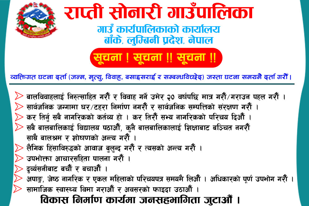 राष्ट्रिय विपद् जोखिम न्यूनीकरण तथा व्यवस्थापन प्राधिकरणले असोज १७ गतेदेखि २० गतेसम्म देशका पाँचवटा व्यापक वर्षाको सम्भावना देखिएकाले यस अवधिमा अत्यन्त जरुरी नपरी टाढाको यात्रा नगर्न सुझाव...