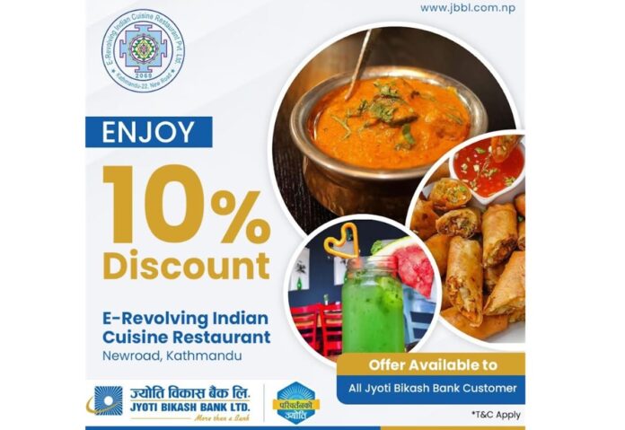 काठमाडौं । ज्योति विकास बैंकले काठमाडौँस्थित इ रिभल्भिङ इन्डियन कुजिन रेस्टुरेन्टमा आफ्ना ग्राहकहरूलाई १० प्रतिशतसम्मको विशेष छुट प्रदान गर्ने सम्बन्धी सम्झौता गरेको छ।