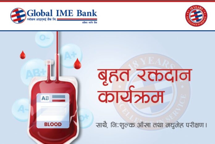 ग्लोबल आइएमई बैंक पौष १८ गते विहीबारदेखि स्थापनाको १८ वर्ष पुरा गरी १९ औँ वर्षमा प्रवेश गरेको छ । यही अवसरमा बैंकले मुलुकका सातवटै प्रदेशमा एकैसाथ रक्तदान कार्यक्रमका साथ–साथै निशुल्क आँखा जाँच, रक्तचाप तथा मधुमेह परीक्षण कार्यक्रम आयोजना गरेको हो ।