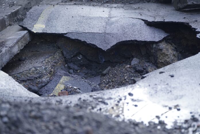 पाइप फुटेपछि ठूलो फोर्समा पानी बाहिर निस्किँदा सडक भत्किएको छ। सडकपेटीमा पनि क्षति पुगेको छ। सडकभरि हिलो र ढुंगाका गिट्टी छरिएका छन्।