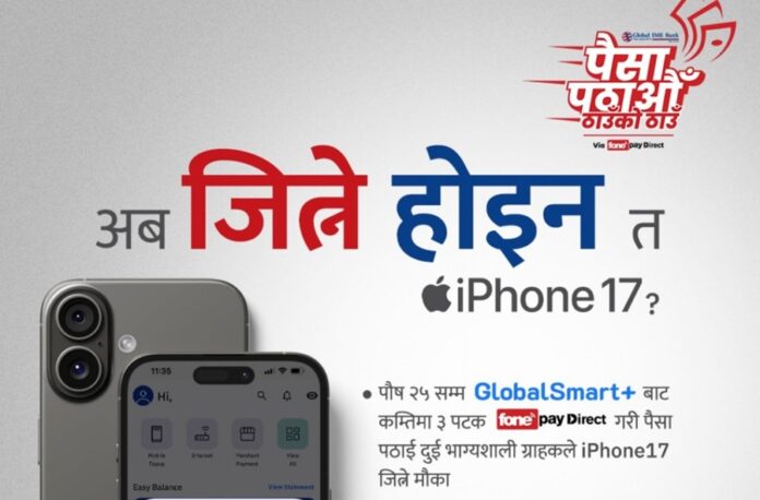 काठमाडौं । ग्लोबल आइएमई बैंकको मोबाइल बैंकिङ्ग–ग्लोबल स्मार्ट प्लसबाट कम्तिमा ३ पटक फोनपे नेटवर्कमार्फत रकमान्तर गर्दा आइफोन १७ जित्ने योजना सार्वजनिक गरेको छ ।