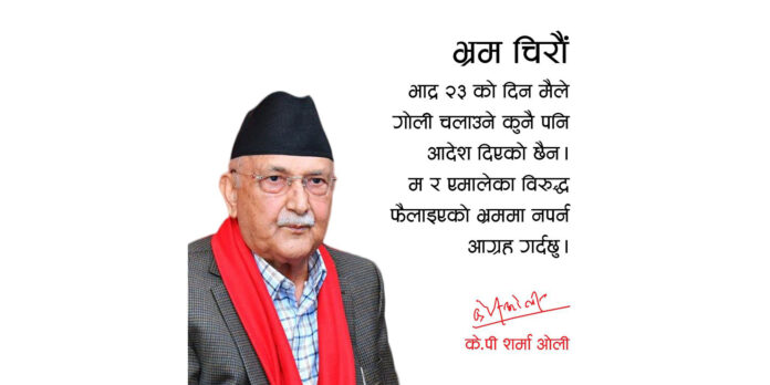 काठमाडौं । निवर्तमान प्रधानमन्त्री एवं नेकपा (एमाले) का अध्यक्ष केपी शर्मा ओलीले भदौ २३ गतेको घटनालाई लिएर आफूले आफ्नै नागरिकमाथि गोली चलाउन आदेश दिएको भन्ने प्रचार पूर्ण रूपमा गलत र निराधार भएको स्पष्ट पारेका छन् ।