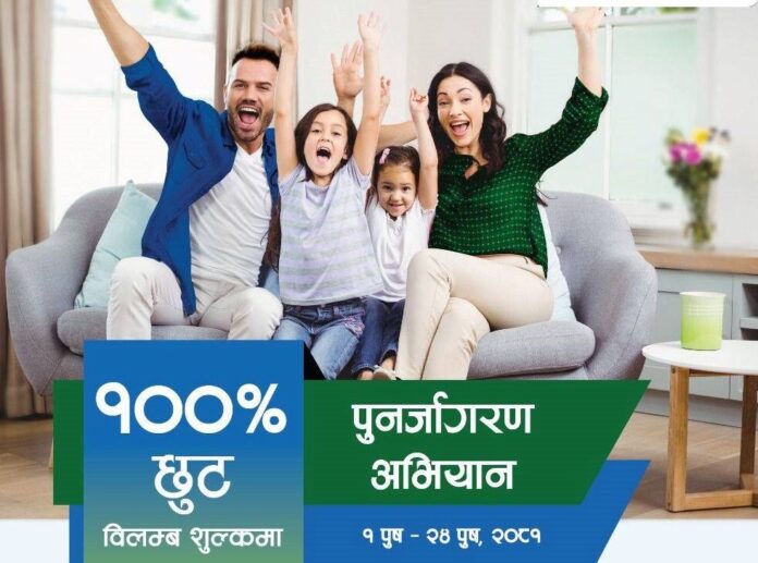 उक्त पुनर्जागरण अभियान यही पुष १ गते देखी २४ गते सम्म लागू हुनेछ । पुनर्जागरण अभियान अन्तर्गत बिमालेख अवधिभित्र एक पटक मात्र ब्याज छुटको सुबिधा प्रदान गरिने कम्पनीले जनाएको छ ।