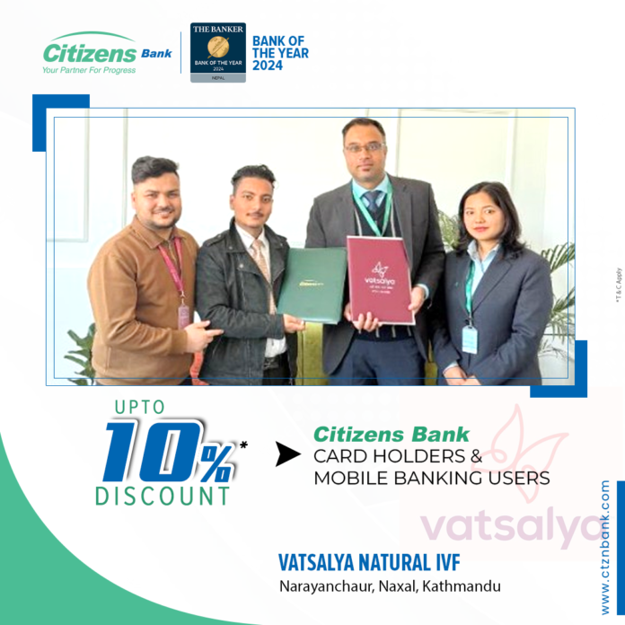 काठमाडौं । सिटिजन्स बैंक इन्टरनेसनल लिमिटेड र नारायणचौर, काठमाडौं स्थित वात्सल्य नेचुरल आइभएफबीच सिटिजन्स बैंकका ग्राहकहरूलाई विशेष छुट दिने समझदारीपत्रमा हस्ताक्षर भएको छ ।