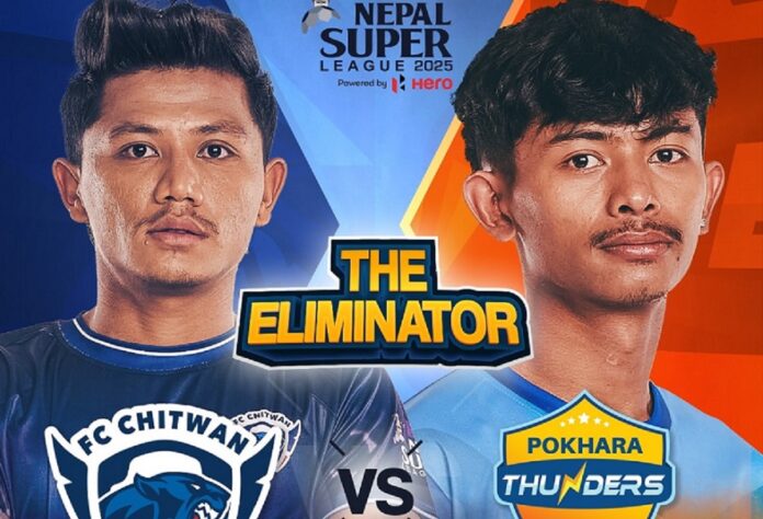 काठमाण्डौं । नेपाल सुपर लिग (एनएसएल) फुटबलको एलिमिनेटरमा आइतबार चितवन एफसी र पोखरा थण्डर्स खेल्दैछन् । खेल त्रिपुरेश्वरमा रहेको दशरथ रङ्गशालामा बेलुका ६ बजे शुरु हुनेछ ।