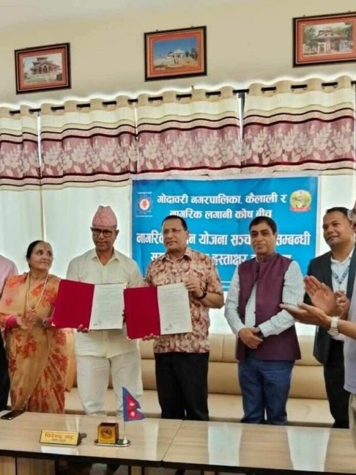 काठमाडौँ। नागरिक पेन्सन योजना सञ्चालन गर्ने सम्बन्धमा नागरिक लगानी कोष र गोदावरी नगरपालिकाबिच सम्झौता भएको छ । नगरपालिकाका शिक्षक, कर्मचारीको मासिक तलबबाट पाँच सय रुपियाँ र नगरपालिकाको शिक्षक, कर्मचारी कल्याणकारी कोषबाट पाँच सय रुपियाँ थप गरी मासिक एक हजार रुपियाँ नागरिक पेन्सन योजनामा जम्मा गर्ने विषयमा कोष र नगरपालिकाबिच सम्झौता भएको हो ।