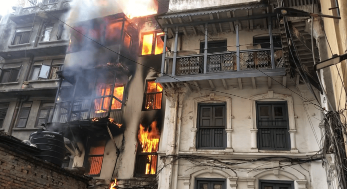 बिहान ६ ः ५० बजे दयाराम श्रेष्ठको घरको तेस्रो तल्लामा ग्यास लिक भएर आगलागी हुँदा छेउमै रहेको रुकेश श्रेष्ठको पाँच तले घरमा पनि आगलागी भइरहेको छ ।