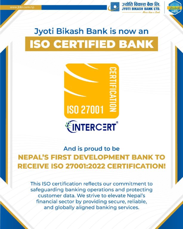 यससँगै आईएसओ २७००१ः२०२२ प्रमाणपत्र प्राप्त गर्ने नेपालको पहिलो विकास बैंकको रूपमा ज्योति विकास बैंक बनेको छ ।