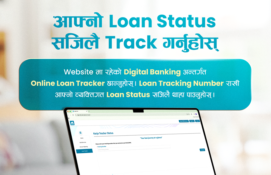 बैंकमा कर्जाका लागि आवश्यक कागजातहरू पेश गरेपश्चात् ग्राहकले एउटा ‘ट्र्याकिङ नम्बर’ प्राप्त गर्नेछन् । सो नम्बर प्रयोग गरी ग्राहकहरूले बैंकको वेबसाइटमा गई डिजिटल बैंकिङ खण्डमा गएर र अनलाइन कर्जा ट्र्याकिङ चयन गरी वा सिधै https://digi.nmb.com.np/loan-tracker मा गएर पनि आफ्नो कर्जा प्रक्रिया कहाँ पुग्यो भन्ने जानकारी लिन सक्नेछन् ।