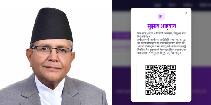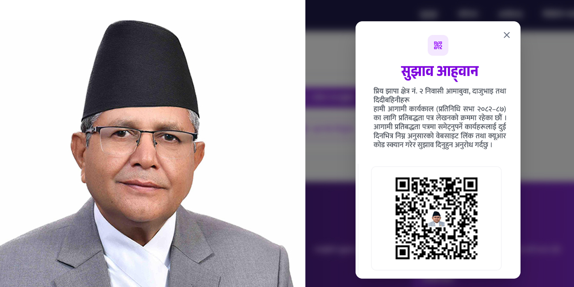 उम्मेदवार घिमिरेले आफ्नो चुनावी प्रतिबद्धता पत्र (घोषणापत्र) तयार पार्न स्थानीय बासिन्दाको प्रत्यक्ष सहभागिता खोजेका छन् । यसका लागि उनले एक क्युआर कोड र वेबसाइट लिङ्क सार्वजनिक गर्दै झापा क्षेत्र नं. २ का मतदाताहरूसँग सुझाव आह्वान गरेका छन् ।