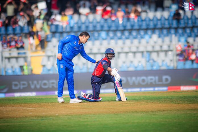 त्यसअघि मुम्बईस्थित वानखेडे मैदानमा टस हारेर पहिले ब्याटिङ थालेको नेपाल १९.३ ओभरमा १२३ रनमै अलआउट भयो ।