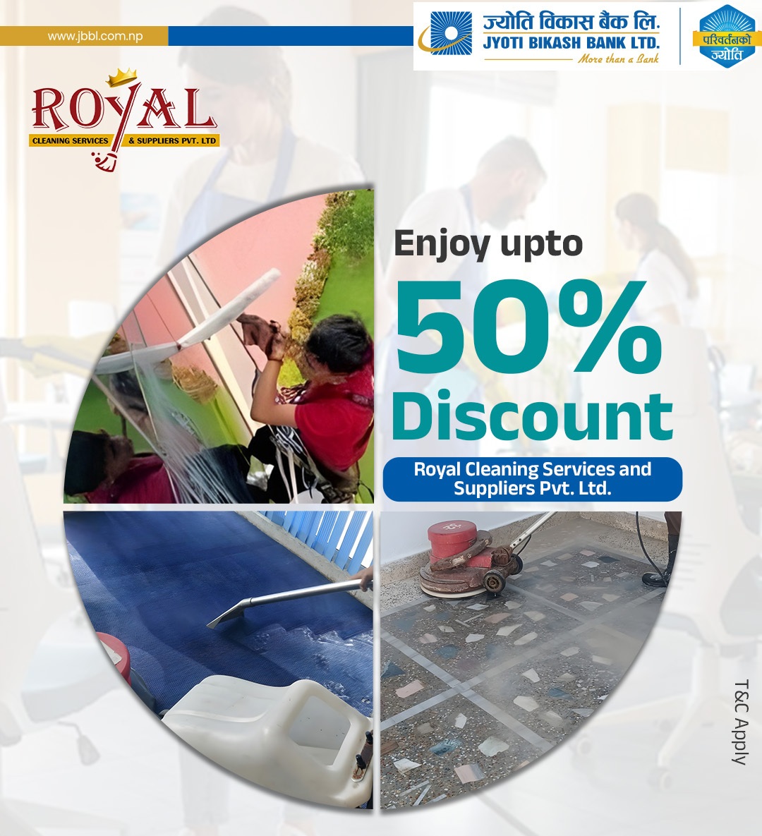 ज्योति विकास बैंकका ग्राहकहरुलाई उक्त कम्पनीबाट सोफा तथा अपहोल्स्ट्री सफाइ, शौचालय सफाइ, चिम्नी सफाइ, पानी ट्यांकी सफाइ, किरा नियन्त्रण (बेडबग), एसी सर्भिसिङ लगायतका विभिन्न सेवाहरुमा छुट प्रदान गर्ने भएको छ।