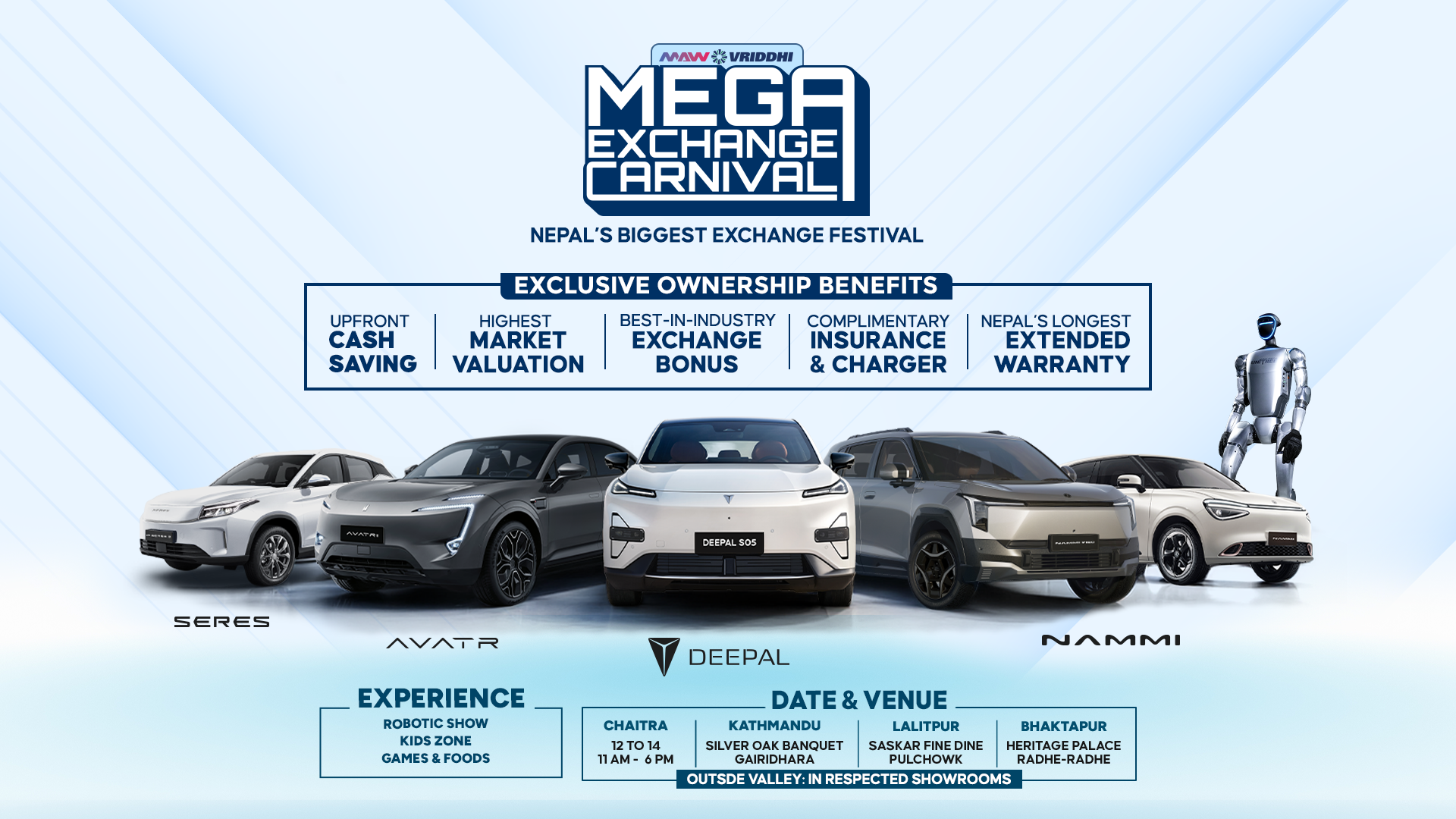काठमाडौं । एमएडब्लु वृद्धिले आफ्नो लोकप्रिय इभी ब्रान्डहरु दिपल, अवतार, नामी र सेरेसलाई एउटै प्लेटफर्ममा समेटेर नेपालकै सबैभन्दा ठूलो मेगा एक्सचेन्ज कार्निभल आयोजना गर्ने तयारी गरेको छ । यही १२ चैतदेखि १४ चैतसम्म देशैभरि आयोजना हुने मेगा एक्सचेन्ज कार्निभल डिजाइन र प्रविधिमा अब्बल इभीमा अपग्रेड हुने सबैभन्दा उत्तम समय हुने कम्पनीले जनाएको छ ।