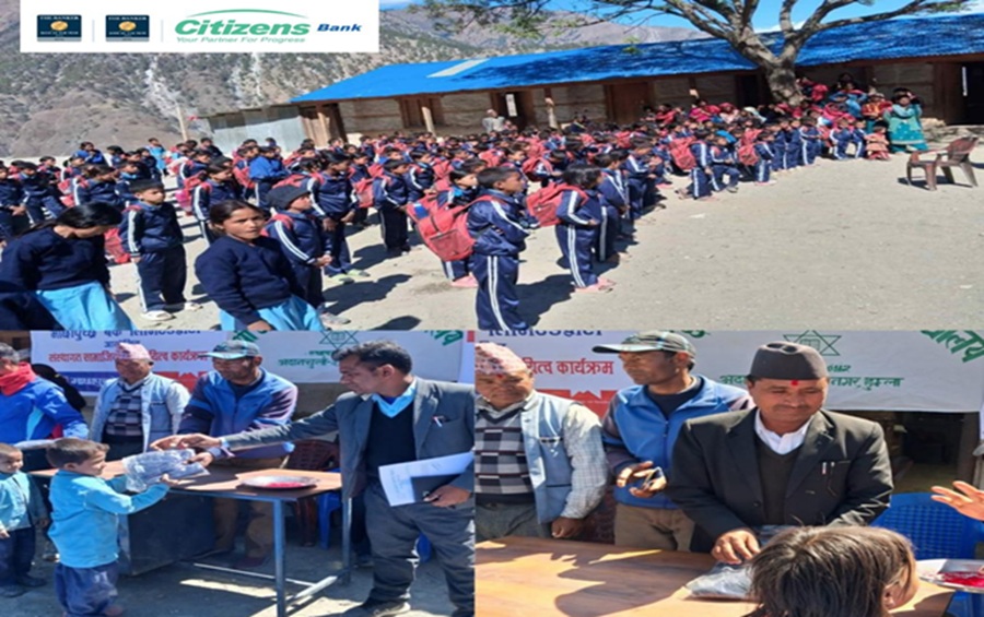 काठमाडौं । सिटिजन्स बैंकले संस्थागत सामाजिक उत्तरदायित्व कायक्रम अन्तर्गत कर्णाली प्रदेश हुम्लाको अदानचुली गाउँपालिका ३ अवस्थित छत्रपाल आधारभूत विद्यालयका २०५ बालबालिलाई ट्रयाकसुटहरु सहयोग प्रदान गरेकोे छ । यो विद्यालय २०५२ वर्ष देखी स्थापना भई सञ्चालनमा आएको हो ।