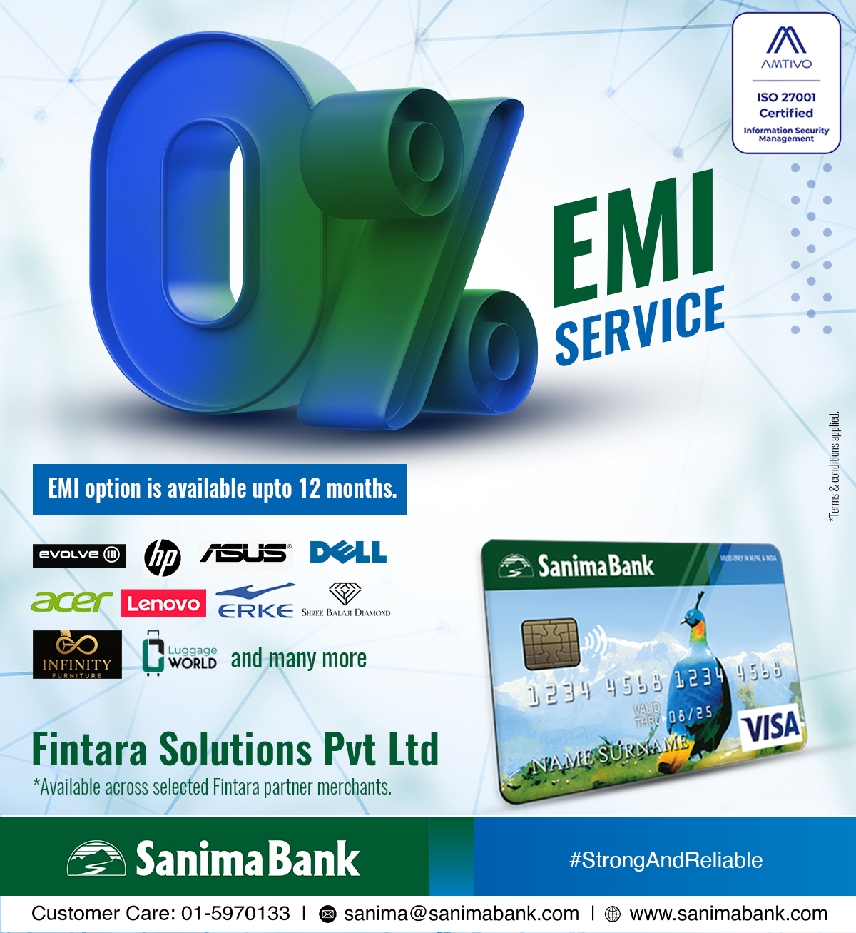 यस सहकार्य अन्तर्गत, बैंकका ग्राहकहरुले फिन्तारासँग आबद्व मर्चेन्ट स्टोरहरुमा सानिमा बैंकको क्रेडिट कार्ड प्रयोग गरि सामान खरिद गर्दा आधिकतम १२ महिनासम्म शून्य ब्याजमा ईएमआई सुविधा उपभोग गर्न सक्नेछन् ।