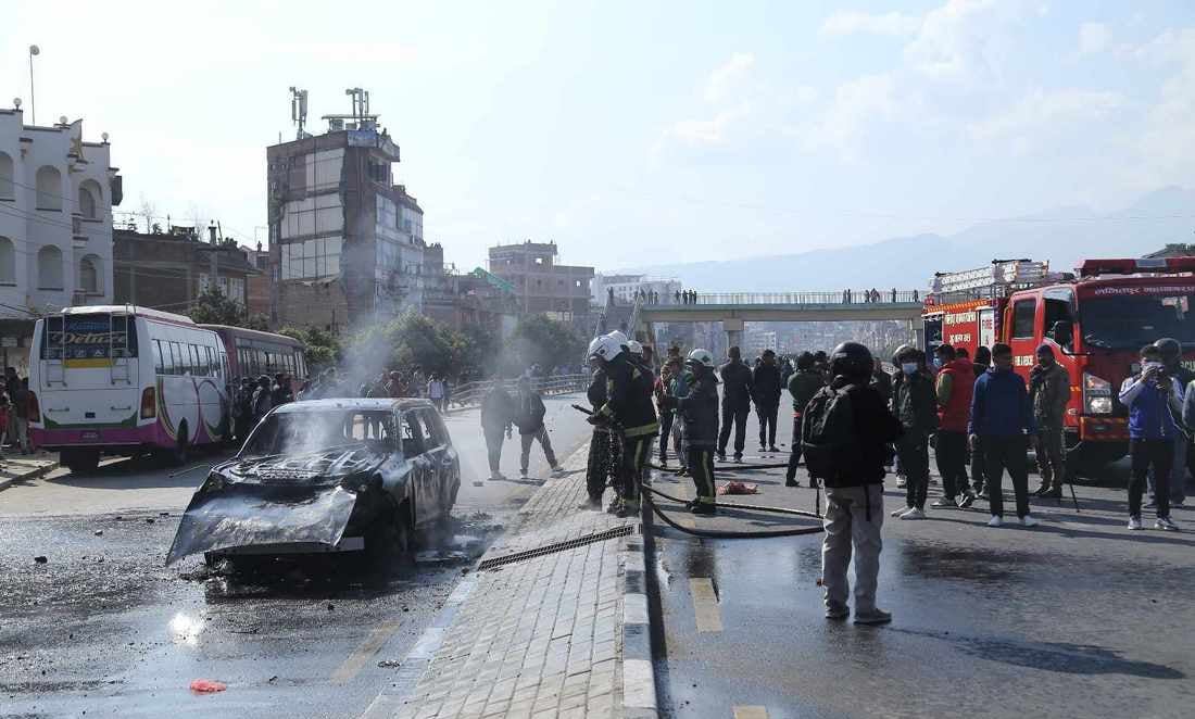प्रदर्शनकारीले भौतिक पूर्वाधार तथा यातायात मन्त्री प्रकाश ज्वाला चढ्ने बा २ झ ५८६१ नम्बरको गाडीमा आगो लगाएका थिए ।